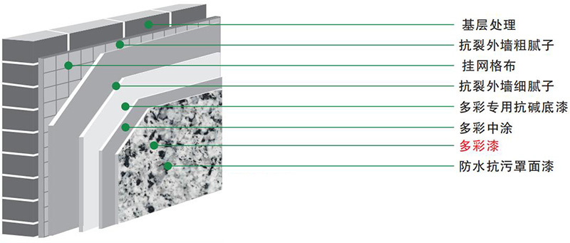 建議配套產(chǎn)品:多彩專(zhuān)用抗堿底漆一遍,多彩中涂一遍,多彩漆兩遍(建議涂裝道數(shù)),專(zhuān)用罩光面漆一遍。